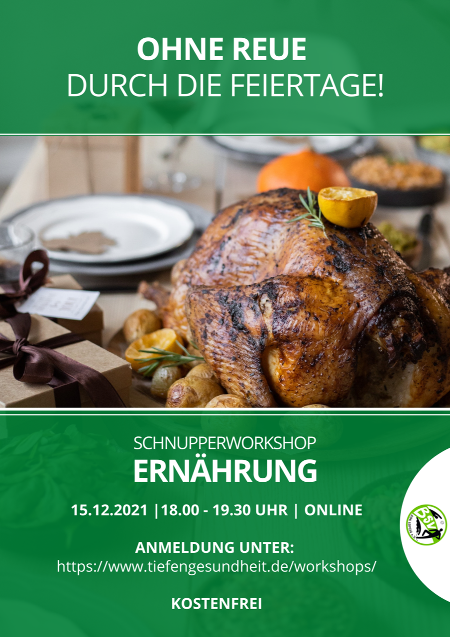 …gönnen wir uns leckeres Weihnachtsessen, Plätzchen Lebkuchen und Glühwein. Danach fühlen wir uns oft überfressen, dick und haben ein schlechtes Gewissen. Bei unserem Online-Schnupperworkshop erfährst Du drei einfache Wege, wie Du ab diesem Jahr Deine Feiertage in vollen Zügen genießen kannst und danach mit einem guten Gewissen auf die Weihnachtszeit zurückblickst.